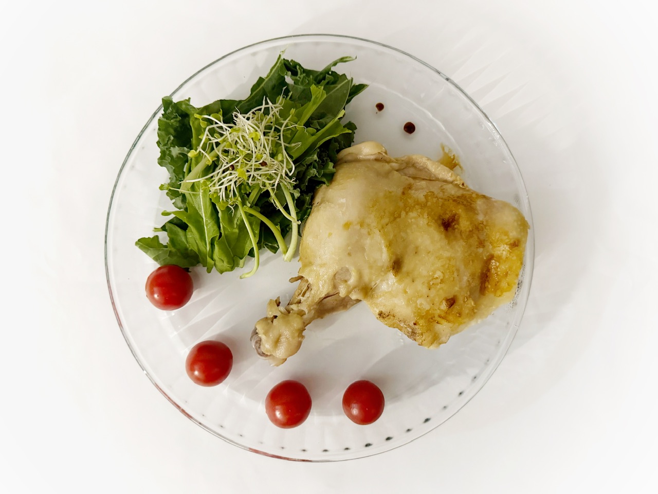 2 器に盛り、ケール、ルッコラ、ブロッコリースプラウト、ミニトマトをを添えてしょうゆをかける。